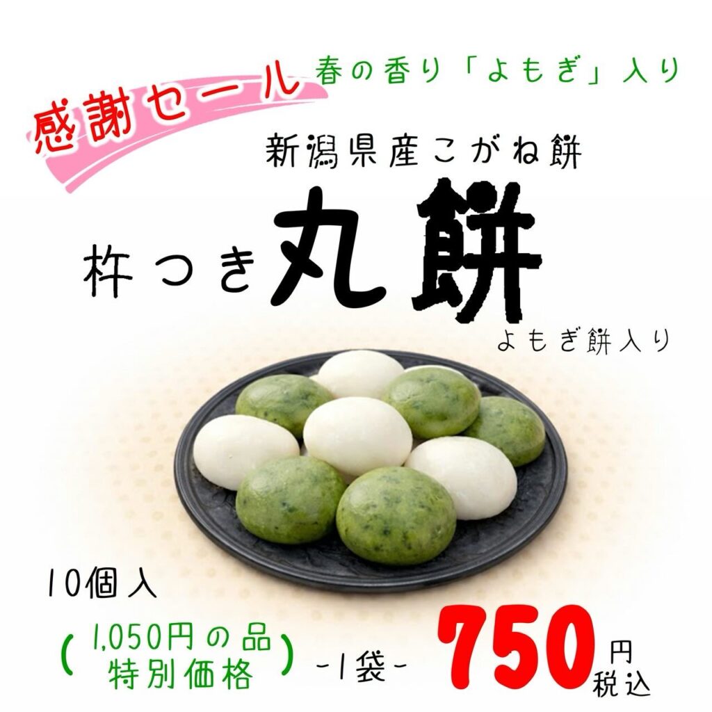 つきたての丸餅に今回は特別に香りのよい「よもぎ」をいれました